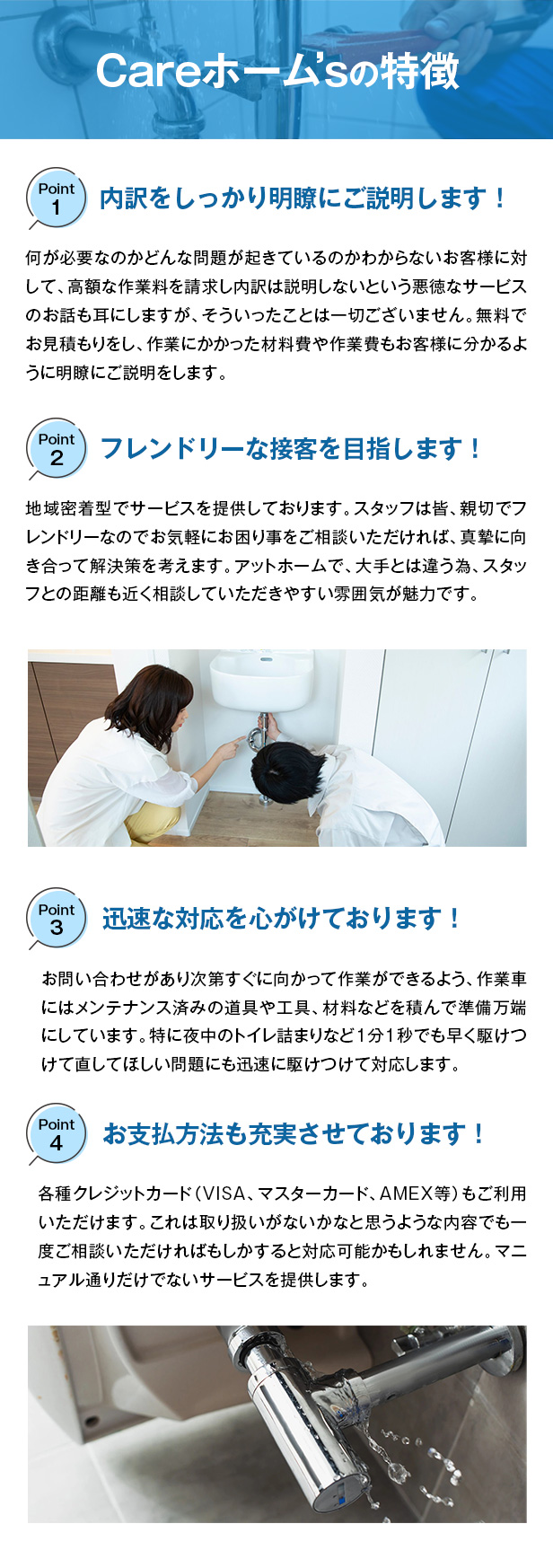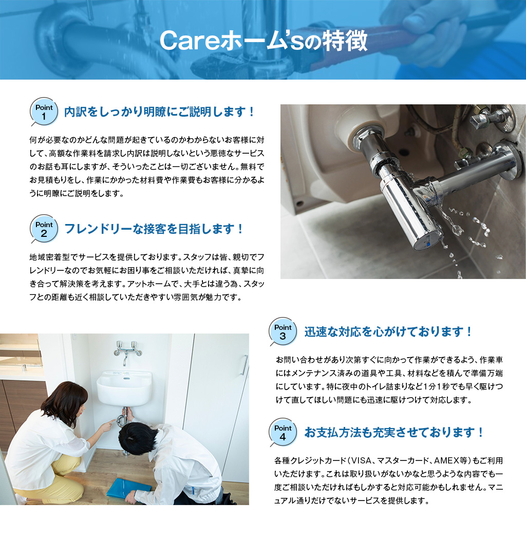 “親切・安心・丁寧”をモットーとするCareホーム’sは、埼玉県さいたま市に拠点を構える水漏れ修理業者です。埼玉以外でも東京・千葉・神奈川でもあらゆる水のトラブルやリフォーム、建物の屋根、外壁の板金塗装まで対応可能な業者で、大手の水道会社にて培った技術や経験をそのままにお客様のお困りごとに迅速に駆けつけてくれます。年中無休・出張費も無料で対応しておりますので、見積り時に思った以上の金額が取られることもなく、料金面が気になるという方も安心してお任せできます。土日祝日も関係なく営業しておりますので、突然発生した水漏れトラブルにも対応してくれます。さらには新型コロナウイルスなど、感染症対策も徹底しておりますのでぜひご検討ください!