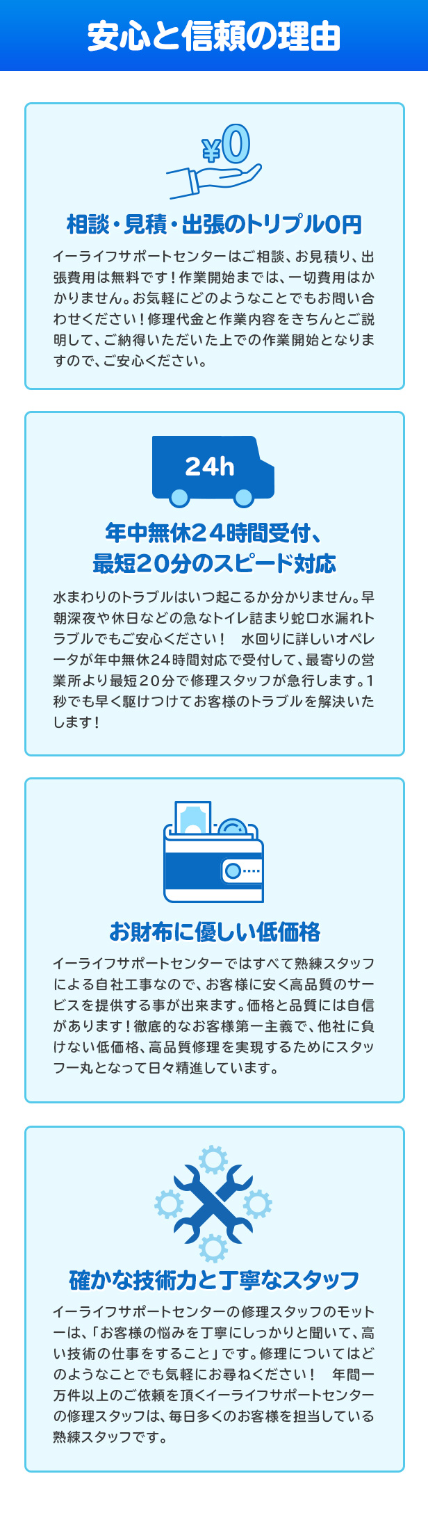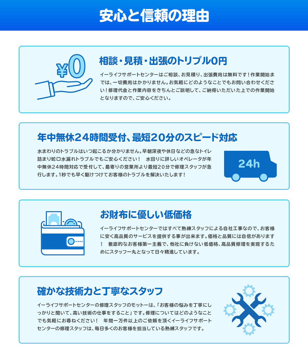 水道局指定工事店に指定されているイーライフサポートセンターは、東京・神奈川・埼玉・千葉・兵庫・京都・奈良・大阪にてトイレつまりや排水のつまり、キッチンの蛇口水漏れなど、水回りのお悩みやトラブルを迅速に低価格で解決してくれます。ご相談、お見積り、出張費用は無料、作業開始までは一切費用はかかりません。早朝深夜や休日などの急なトイレ詰まり蛇口水漏れトラブルでも対応してくれるのでありがたいですね!さらにはすべて熟練スタッフによる自社工事なので、安く高品質のサービスを提供可能とのこと。お支払方法も充実しているので、急な出費で手持ちがなくとも大丈夫!大阪近辺の方は是非ご検討ください!