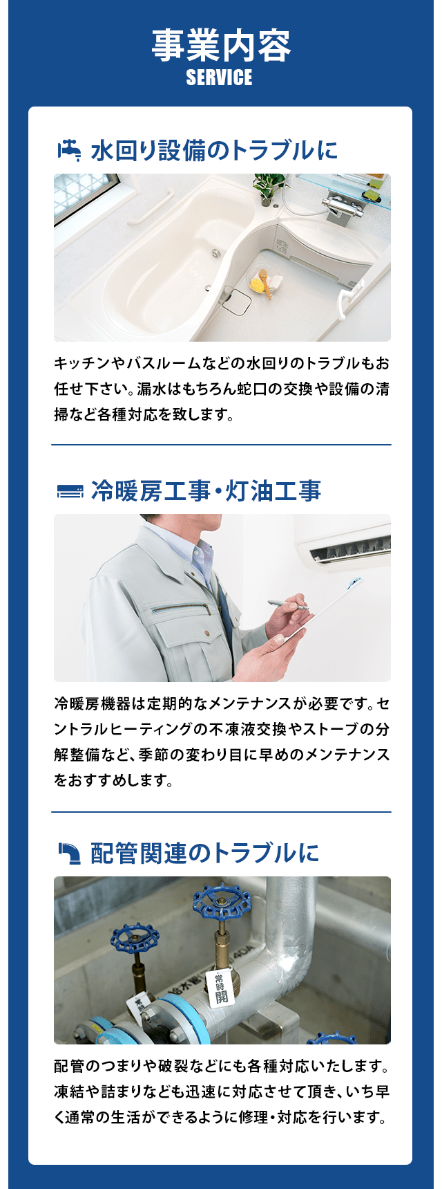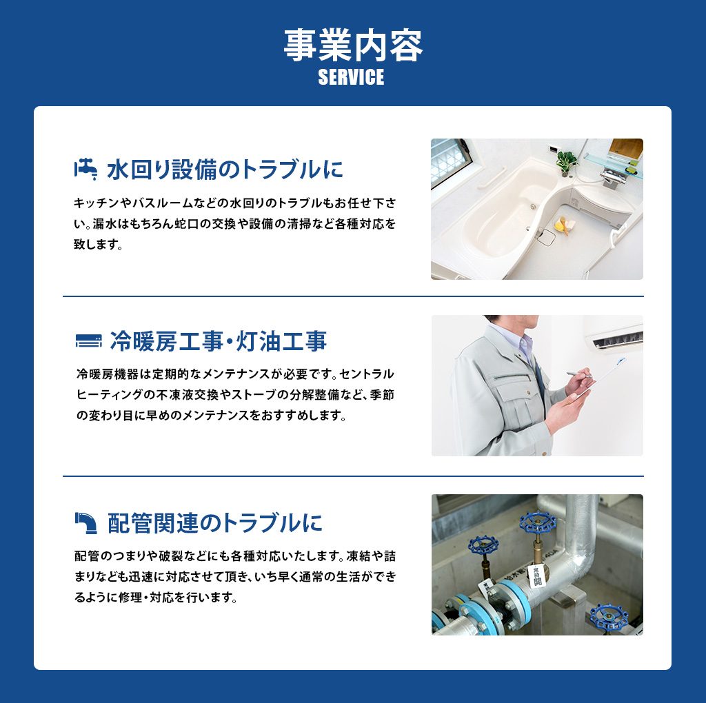 「住宅設備のぶ」は、北海道の十勝管内全域(帯広市、音更町、士幌町、上士幌町、鹿追町、新得町、清水町、芽室町、中札内村、更別村、大樹町、広尾町、幕別町、池田町、豊頃町、本別町、足寄町、陸別町、浦幌町)を対応エリアとする水道業者で、年中無休・24時間対応で価格もリーズナブルなのがありがたい。業務内容としては、「各種住宅設備の修理・メンテナンス・清掃・交換」を行っており、温熱機器(ボイラー・ストーブ・パネル など)、水回り(キッチン・トイレ・バスルーム・洗面台 など)、配管設備(凍結解消・破損修理・漏水 など)、空調機器 (エアコン・換気扇 など)に対応してくれる。北海道の十勝管内全域の方はぜひご検討ください。
