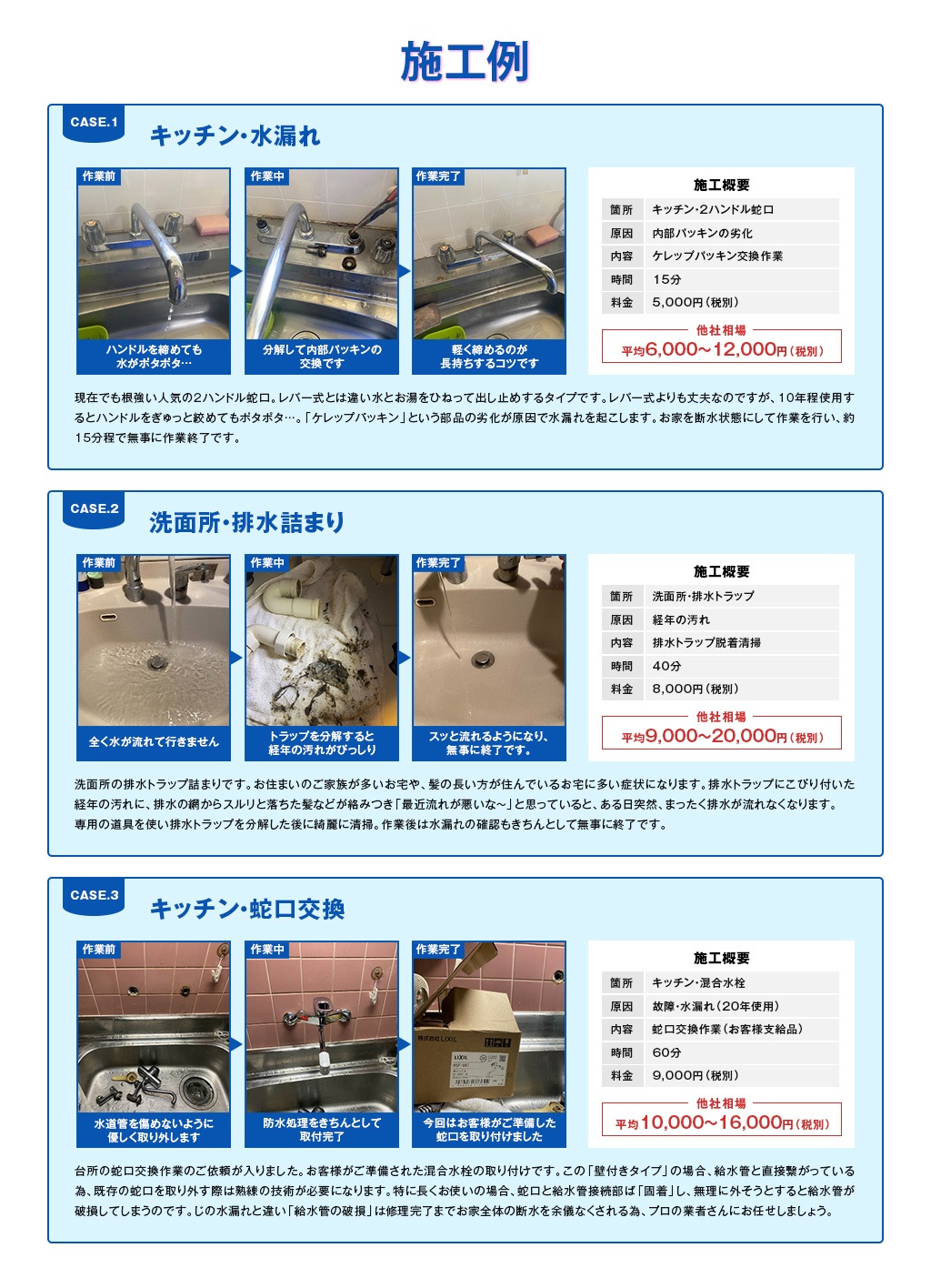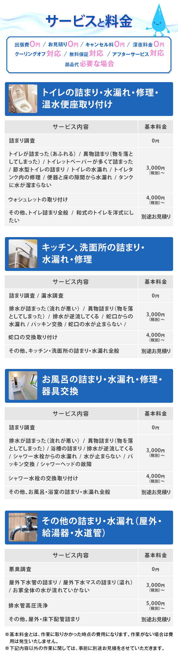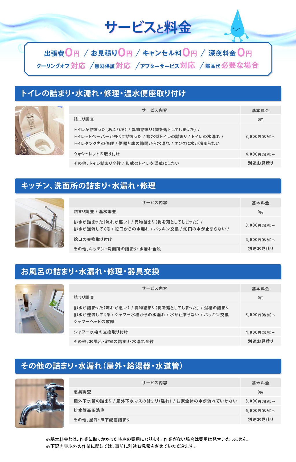 ご安心ください。出張費・キャンセル料等、全て無料で行っております。急な水漏れや詰まりなど、御見積りのみも喜んで対応致します。