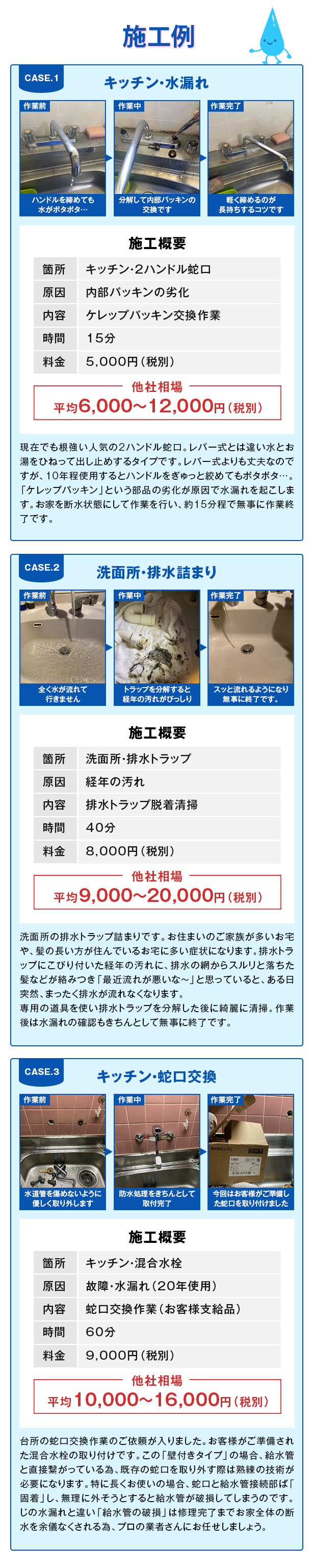 水漏れ・詰まりなどの各所トラブルを、スピーディーに解決いたします。