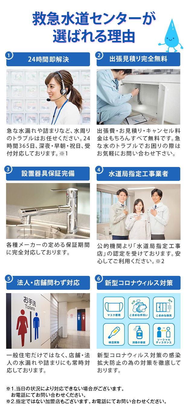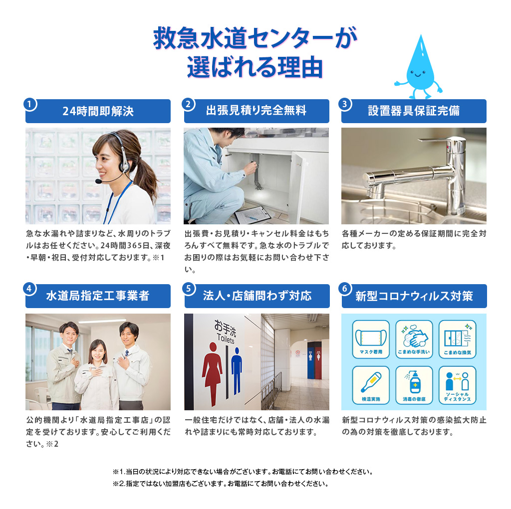 救急水道サービスは東京・神奈川・千葉・埼玉・茨城・栃木・群馬・福島・大阪・奈良を対応エリアとする業者で、水回りのトラブルに365日24時間・深夜・早朝も受付対応してくれて、出張費・お見積り・キャンセル料金もすべて無料というありがたい業者。しかも一般家庭だけでなく、店舗や法人の水漏れやつまりにも対応してくれます。さらに水道局指定工事業者でもありますし、WEB割引で3,000円OFFになるということなので、水回りのお困りごとが発生した際には、ぜひご検討ください!