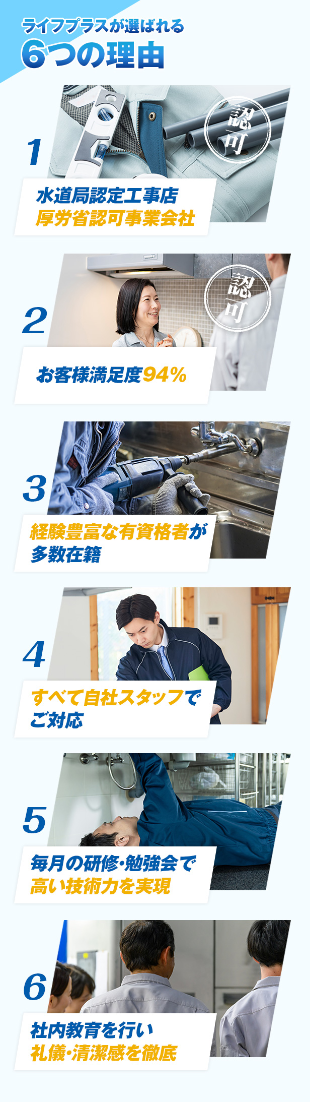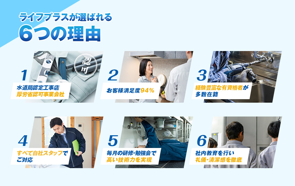 ライフプラスは全国的に展開している業者さんで、あらゆる水のトラブルに対応してくれます。安心の水道局認定工事店であり、対応実績も年間3万件、お客様満足度も94%と信頼と実績の水道修理業者さんです。修理に応じて1~3年の無料点検、無料保証が用意されているのも魅力の一つ。お支払方法もクレカやコンビニ後払い、PayPayにも対応しているので助かりますね!出張見積も無料で土日・祝日でも深夜でも駆けつけてくれるので水道トラブルの際にはぜひ検討されてみてはいかがでしょうか?