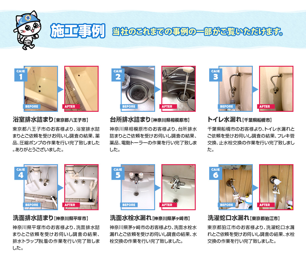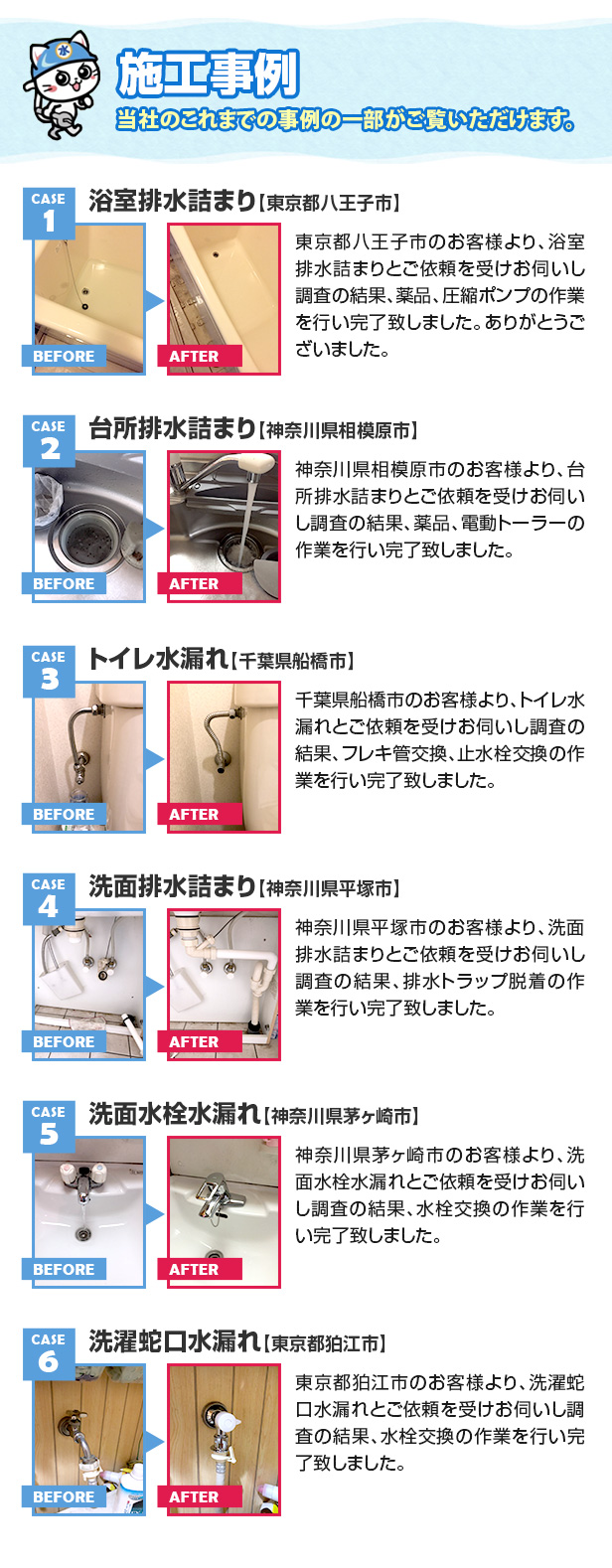 キッチンの排水が詰まって流れなくなってしまい、電話をして1時間程ですぐに駆けつけてくださいました。その後、来客がある予定でしたのでそれまでに直していただけて良かったです。原因や予防策などもきちんと説明してくださり安心できました。この度はありがとうございました。