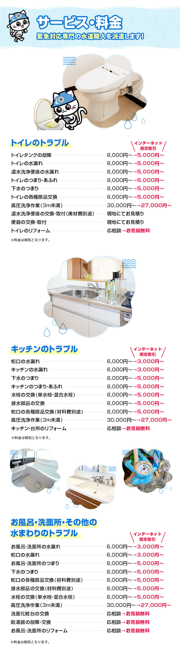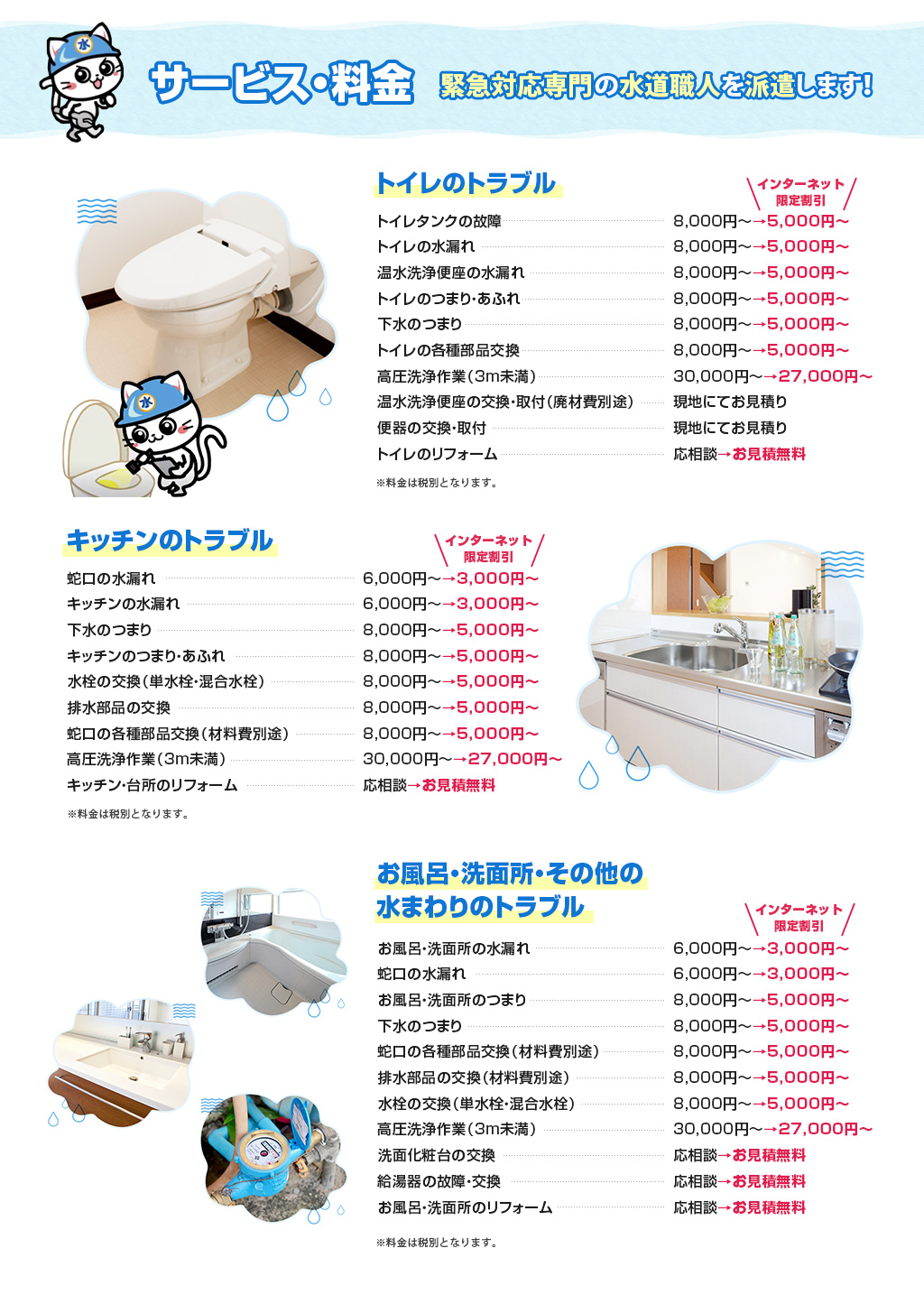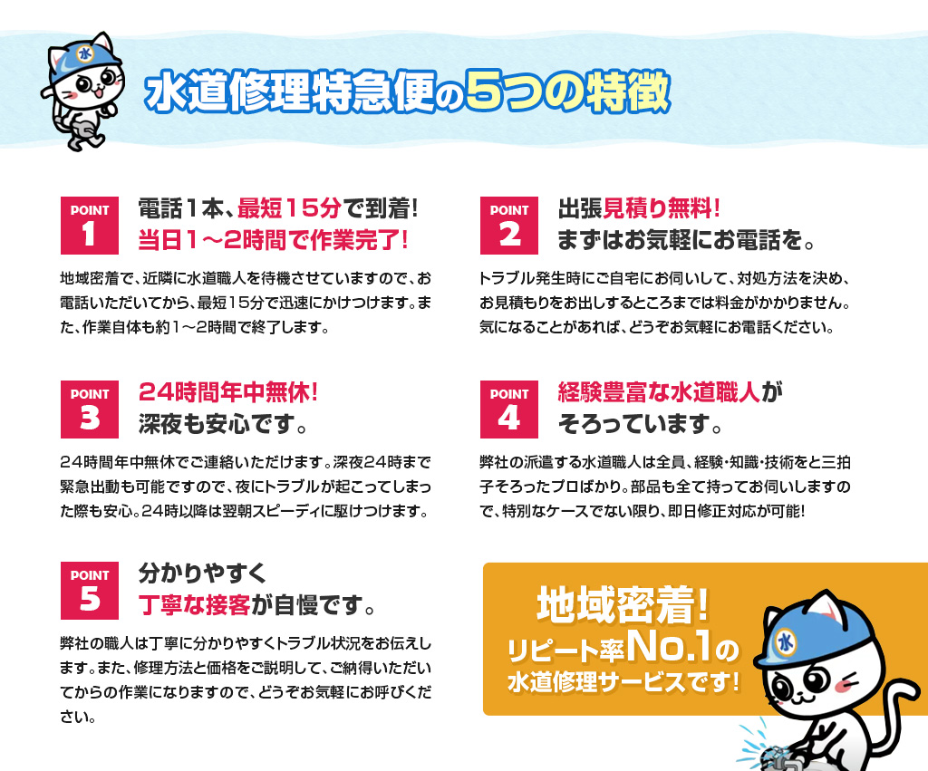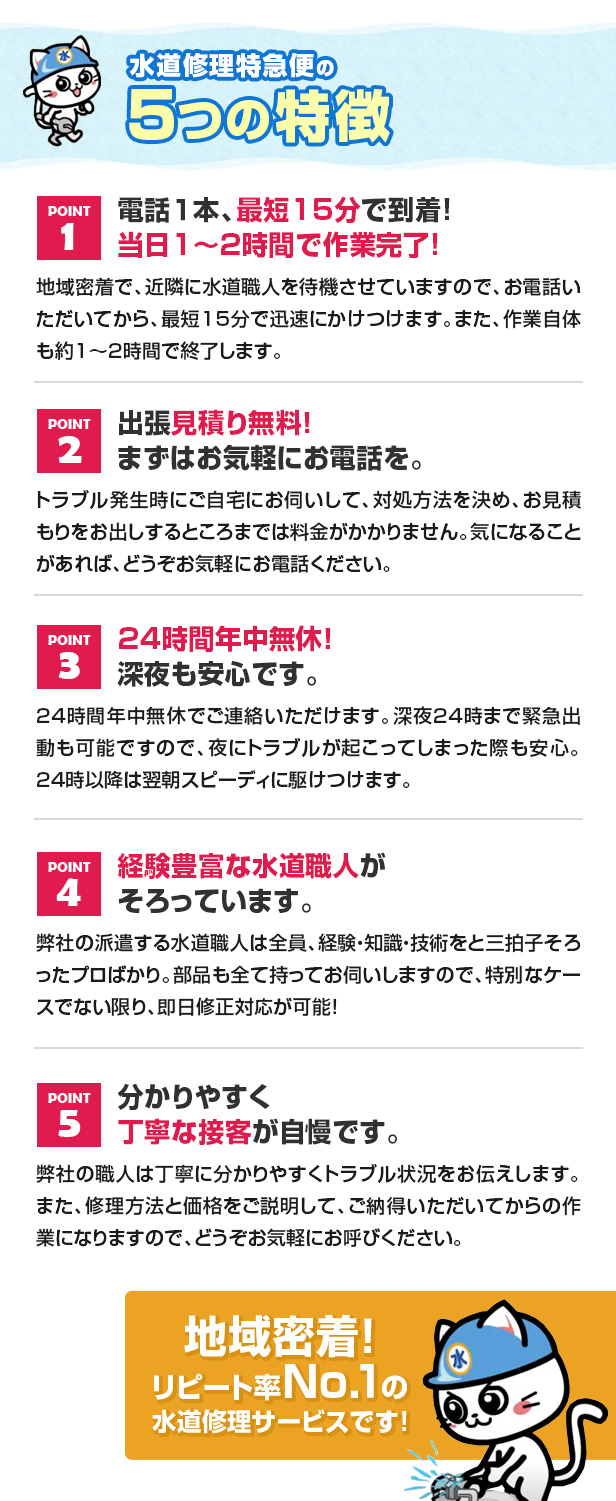 水道修理特急便は、埼玉・千葉・東京・神奈川・大阪と広範囲で緊急の水道修理を行っていて、キッチンやバス、トイレの水漏れや詰まり・便器の破損・ウォシュレットの故障・給湯器の故障・水道管の破裂など広範囲に渡るトラブルの修理から設備交換までを、原則当日その場で完了させてくれるありがたい業者です。しかも水道局指定工事店であり、業歴も20年と実績も十分で信頼できる業者だと思います。もし営業時間外や対応地域外の場合でも相談・対応可能とのことなので、一度お問い合わせしてみるのもいいでしょう。賃貸マンションやビル、飲食店の経営・管理をされている方にも対応しているのでぜひご検討してみては?