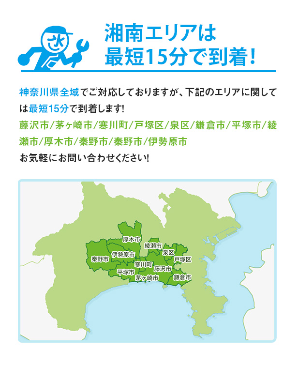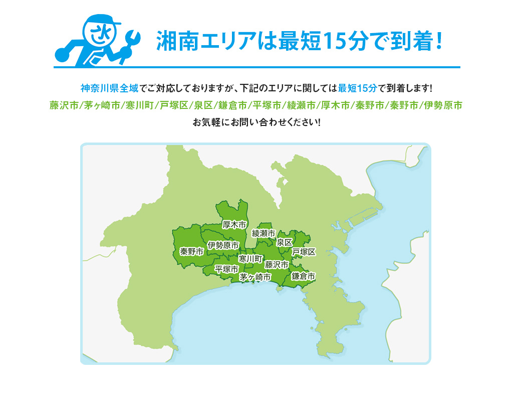 伺えるお時間を伝えます。藤沢市を中心とした湘南エリアは最短15分で駆けつけます!緊急事態もお任せください。