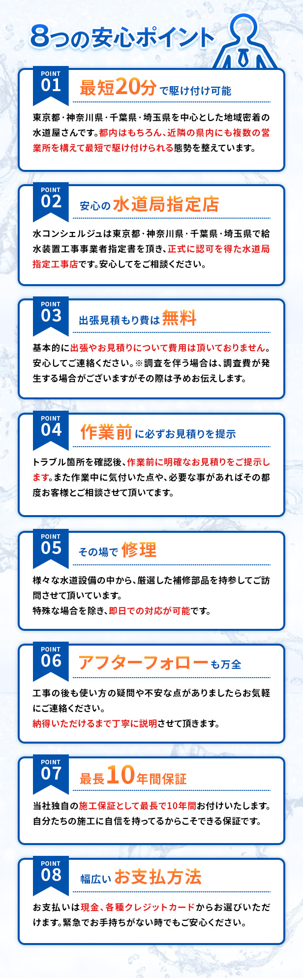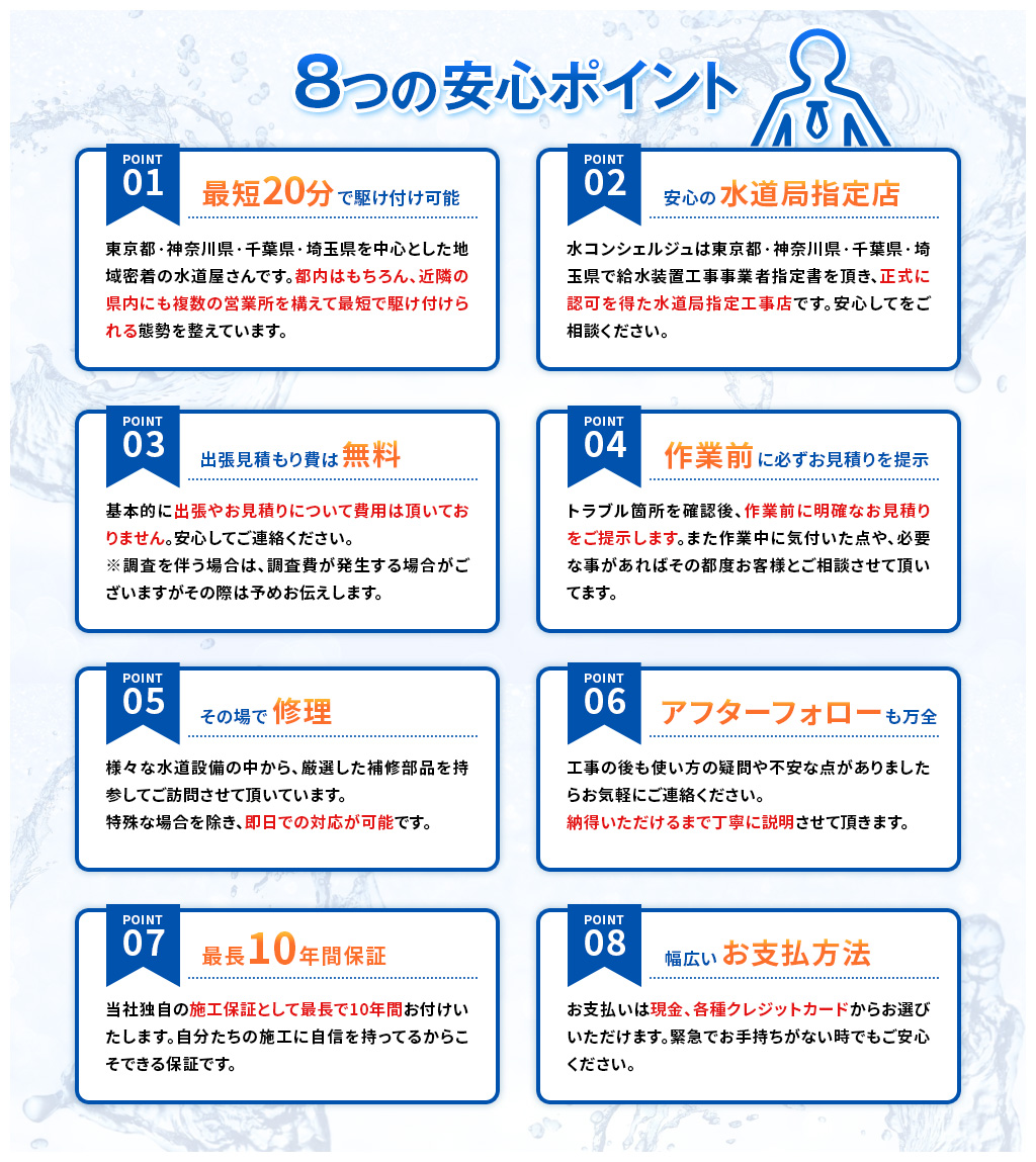 「水コンシェルジュ」は東京・神奈川・埼玉・千葉にてあらゆる水回りのトラブルに対応可能で、最短20分で駆けつけてくれます。水道局指定工事店に認定されており、安心してご依頼いただけます。しかも出張・見積もりが無料で、深夜割増などもなく、お支払方法も現金だけでなくクレジットカードにも対応しているので嬉しい限りですね!アフターフォローに関しても、工事後の疑問点や不安なことも丁寧に説明してくれるということなのでさらに安心ですね。一都三県にお住まいの方で水回りのトラブルでお困りの方はぜひご検討されてはいかがでしょうか。